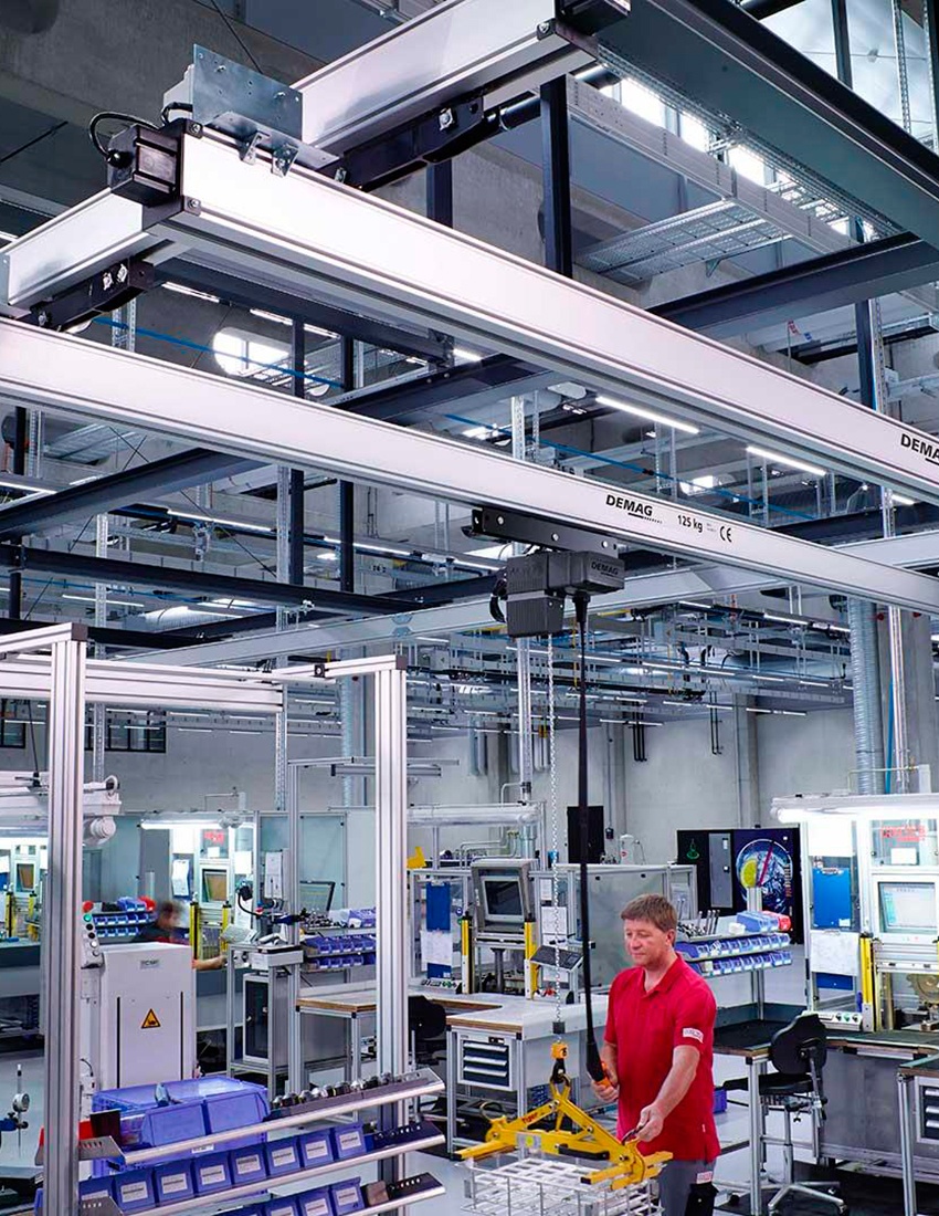 Модульна конструкція Demag KBK Aluline дозволяє врахувати просторові особливості виробничого приміщення ще на етапі проєктування. Оптимізовані кранові візки мають зменшені габарити підходу, що дозволяє ефективніше використовувати доступний робочий простір. Завдяки збільшеним відстаням між підвісами та можливості інтеграції струмопідвідної лінії система забезпечує більшу гнучкість під час проєктування, а також дозволяє скоротити обсяг монтажних робіт і знизити витрати на встановлення кранової системи.