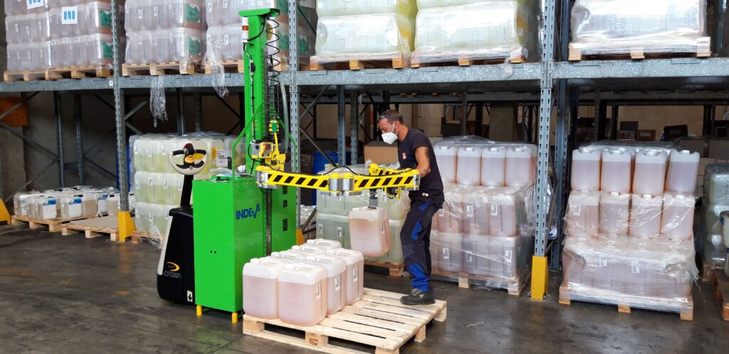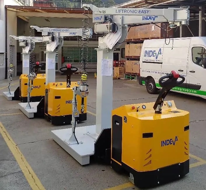 INDEVA® Liftruck is an industrial manipulator that includes an order picker to carry the pallet with reels, an INDEVA® Liftronic® with articulated arm and an orbital tool head for handling reels. Necessary within the textile industry in the texturizing, spinning and weaving areas to load creels up to 5 m high with reels of max 40 kg . A single man can carry out the whole work cycle: collect pallets in the stock room and carry them up to the creel, place the spools on the creel prior 90° rotation, collect and carry all the tubes and partition carton blanks. The operator can quickly and precisely pick and release the reels, by means of the orbital tool head with expanding chuck . The release is allowed only when the reel is safely placed on the pin. The electronic balancer INDEVA® grants a smooth, quick and precise reel handling.An INDEVA® Liftruck can be used also for handling cardboard cases by means of a vacuum gripper.