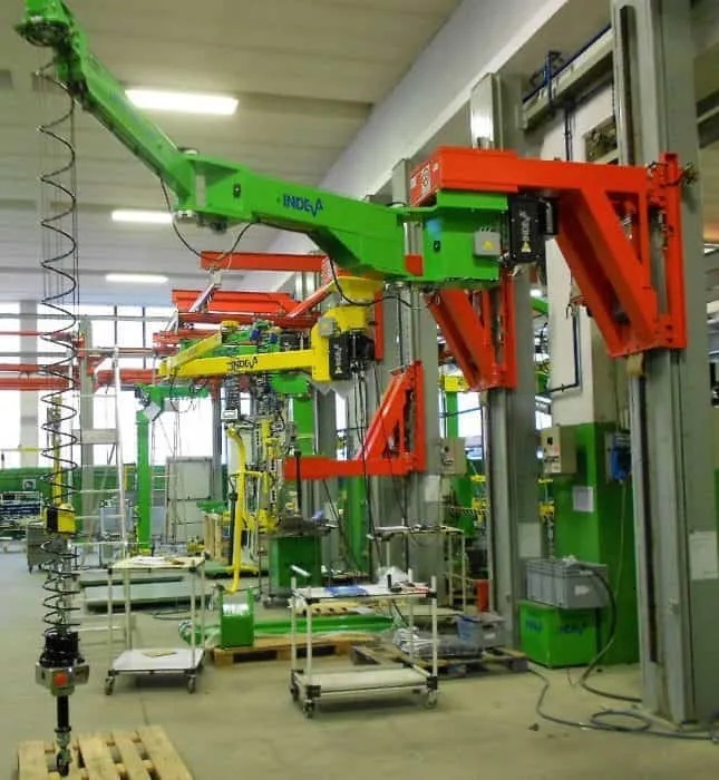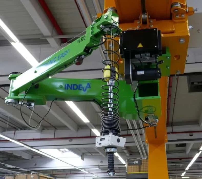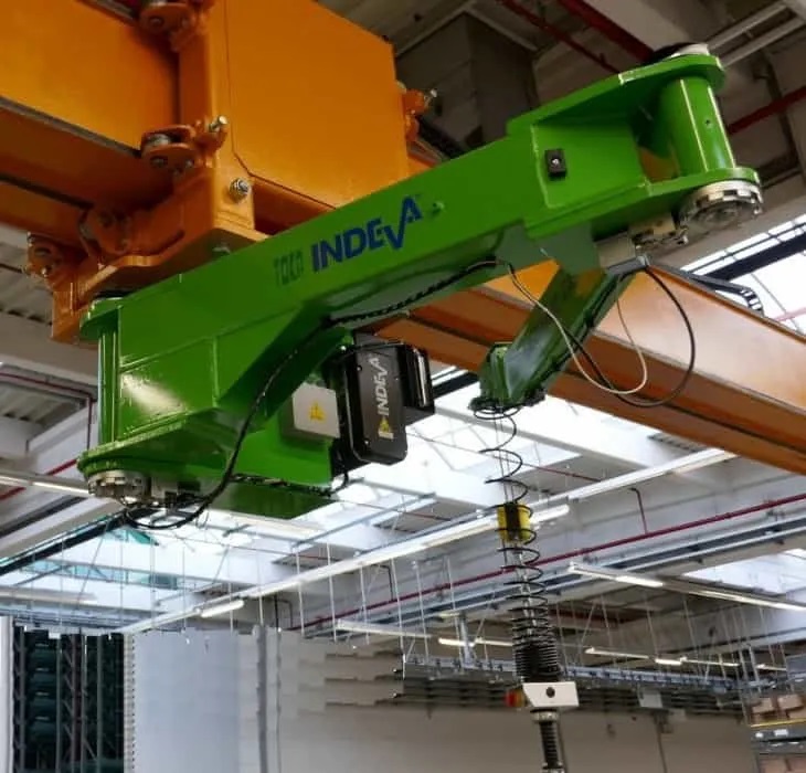 Overhead rail or ceiling mounted INDEVA® Liftronic® Pro with articulated arm. This solution is suitable when you can’t use any space on the floor for a column mounted solution or you need to cover a large area.