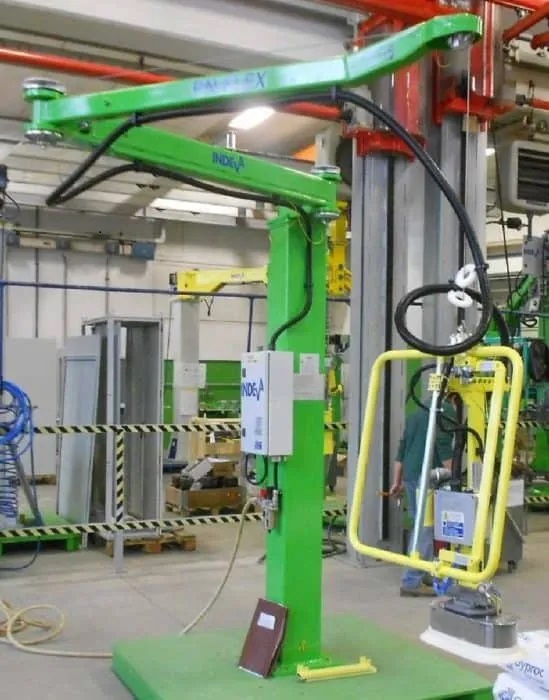 - Пневматические промышленные манипуляторы PN Compatto с шарнирным рычагом, закрепленным на подвесной балке. Также доступна модель потолочного монтажа.