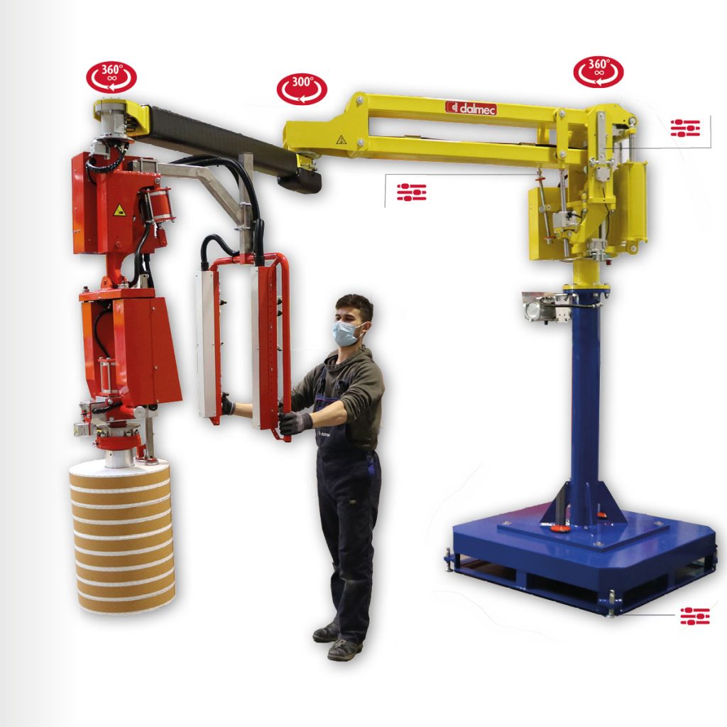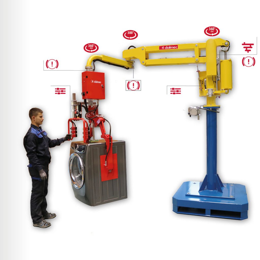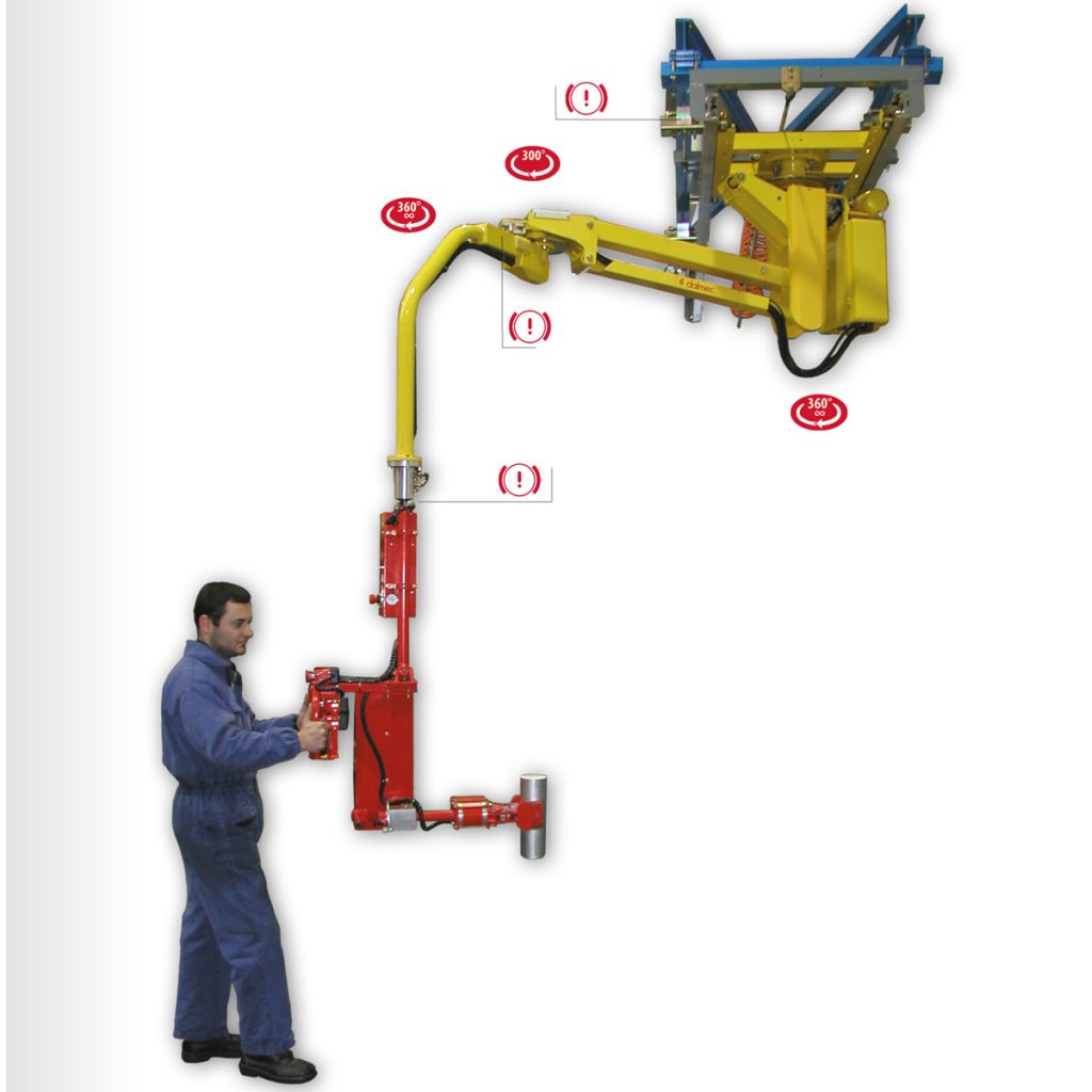 Пневматический манипулятор MEGAPARTNER MG с шарнирными рычагами, оснащенный специальными захватывающими инструментами, подходит для обработки тяжелых (максимум 1500 кг) и смещенных грузов в любом направлении, позволяя оператору работать с минимальными усилиями в хороших эргономичных и безопасных условиях.