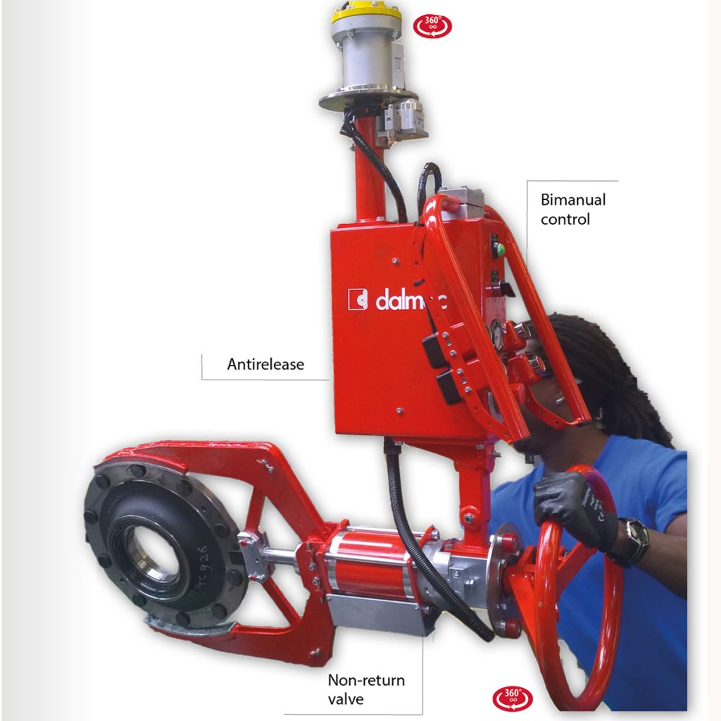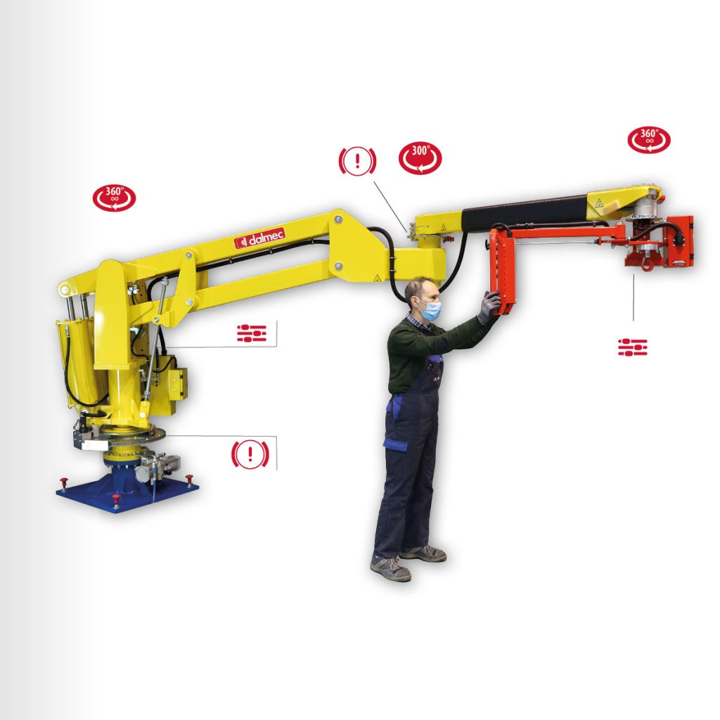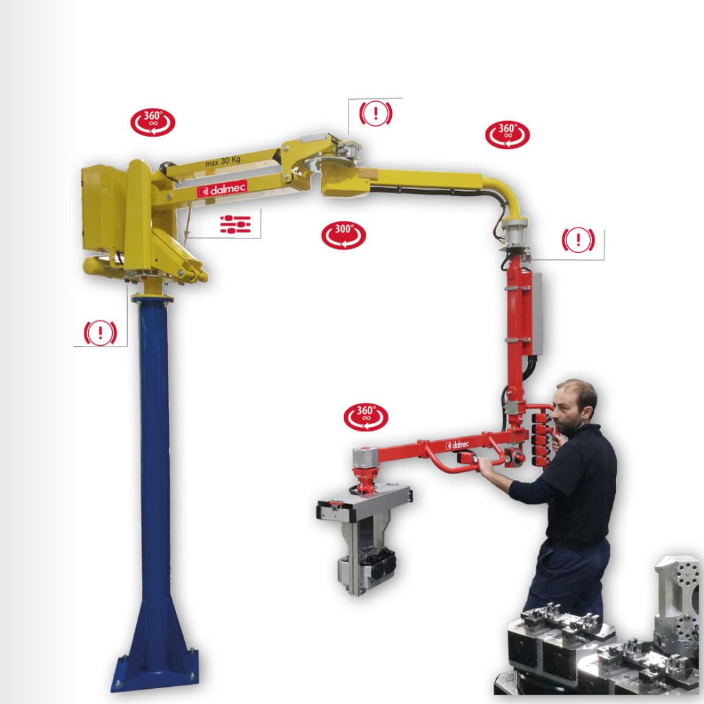 Пневматический манипулятор MEGAPARTNER MG с шарнирными рычагами, оснащенный специальными захватывающими инструментами, подходит для обработки тяжелых (максимум 1500 кг) и смещенных грузов в любом направлении, позволяя оператору работать с минимальными усилиями в хороших эргономичных и безопасных условиях.