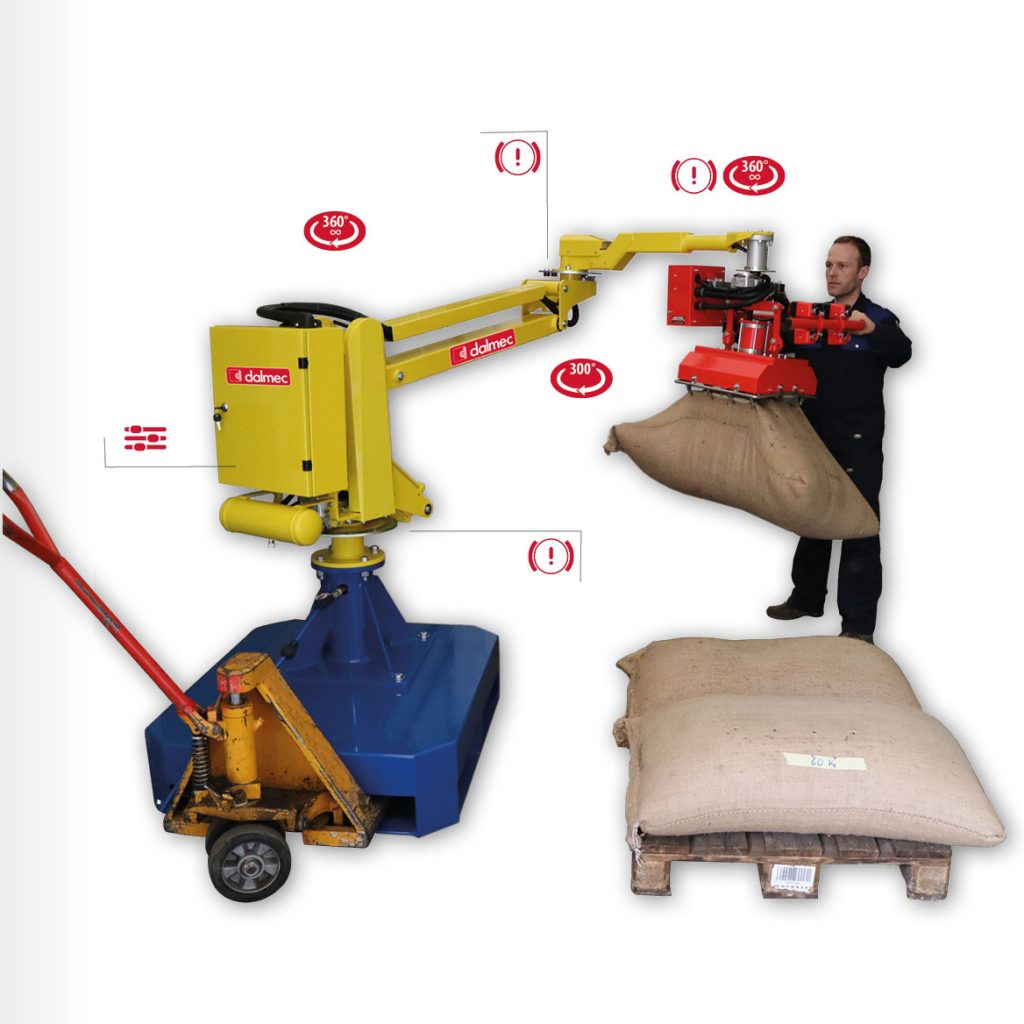 Пневматичний маніпулятор Partner EQUO, обладнаний спеціальними пристроями, відповідає вимогам переміщення різного виду вантажів зі зміщеною віссю.