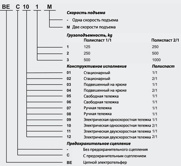 Техническе данные цепных электро талей Balkansko Echo серии ВЕ |
